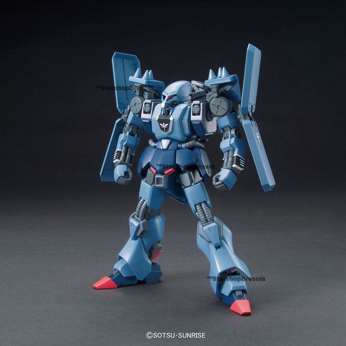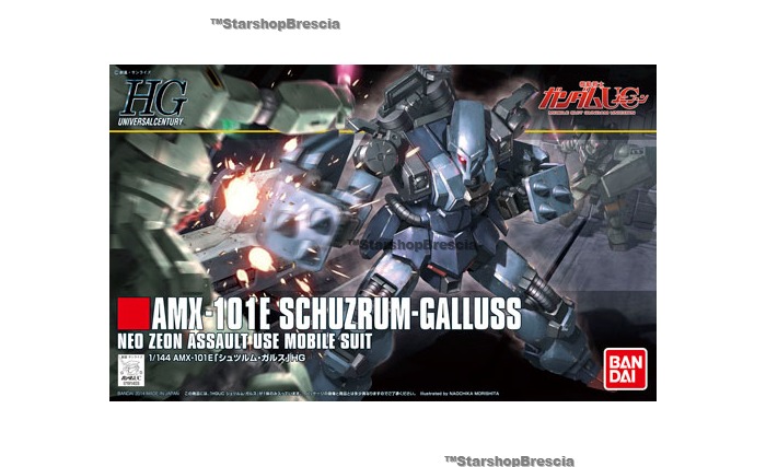 From Bandai, here's a High-Grade model kit of the AMX-101E Schuzrum-Galluss from "Gundam Unicorn". The Schuzrum Galluss comes armed with a spike shield and a chain mine. Includes stickers for markings.