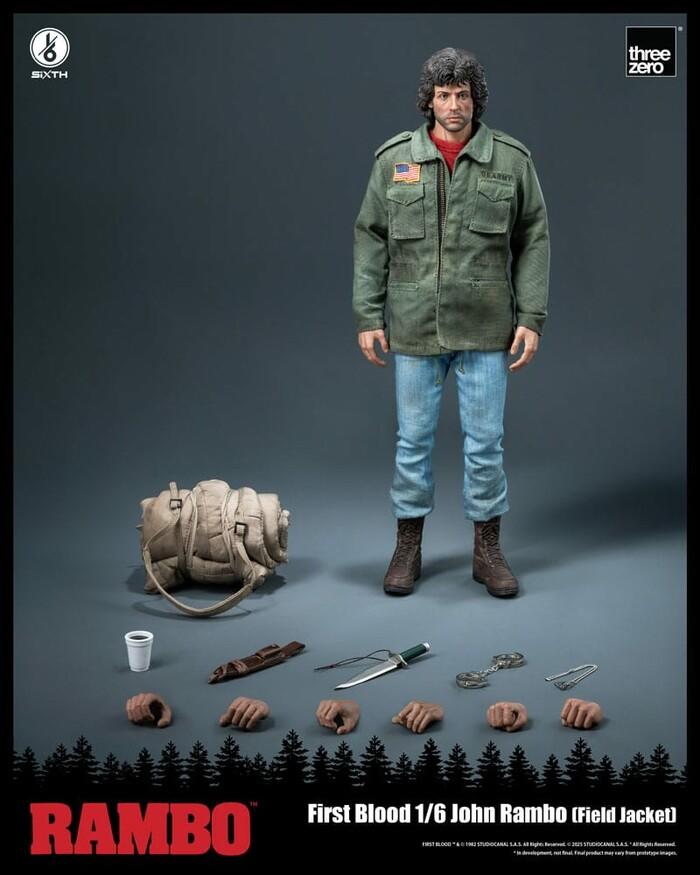 The "Rambo: First Blood -1/6 John Rambo (Field Jacket)" collectible figure stands approximately 30.8 cm tall and features a fully articulated body. It accurately represents the character as depicted in the 1982 film "First Blood."