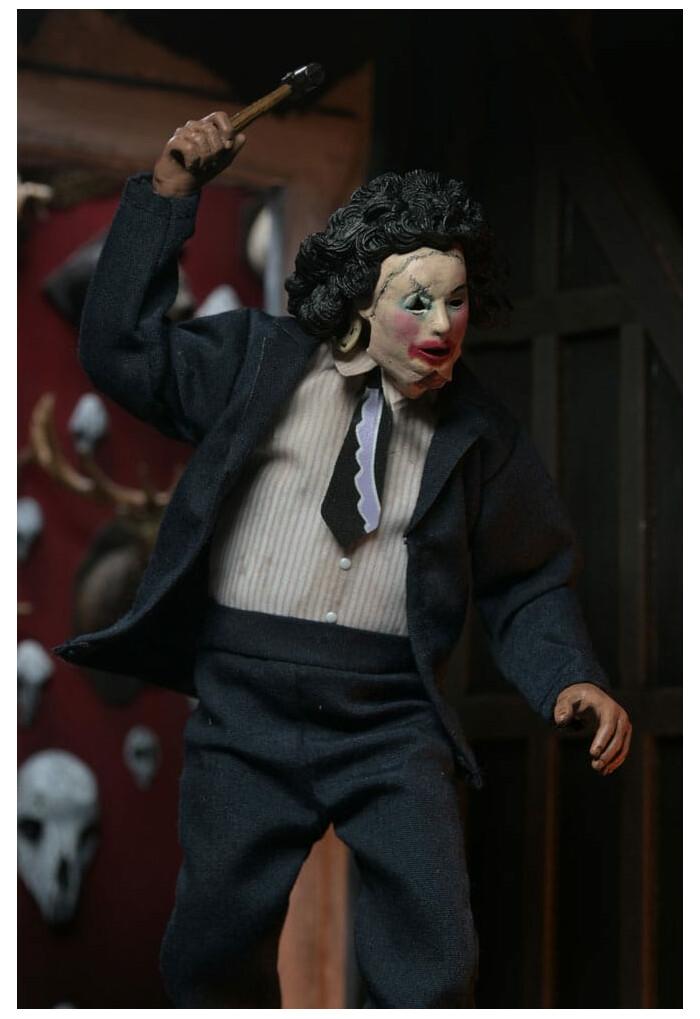Donning his classic blue suit and infamous mask, this fully articulated, 8-inch figure includes his iconic chainsaw, an alternate hand, short hammer, knife, and bracelet accessories. Leatherface is all dolled up and ready to join your next family dinner! Comes in collector-friendly window box packaging.