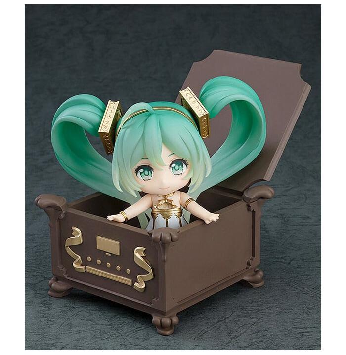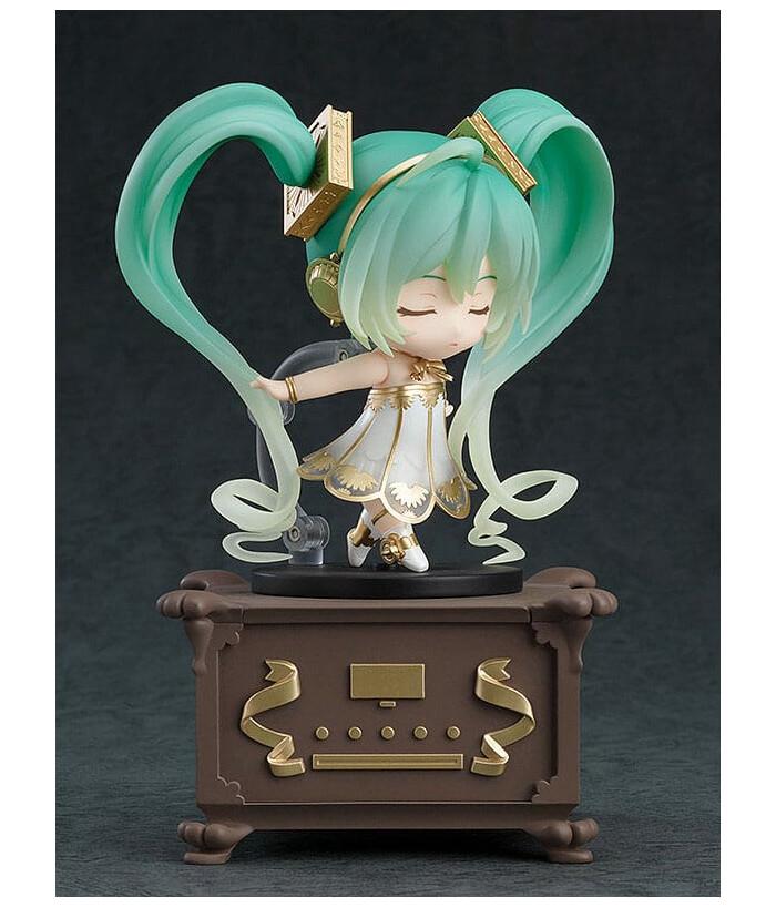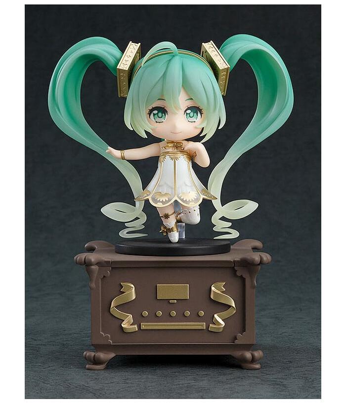 Her gramophone-inspired dress has been recreated in detail with translucent parts and gold paintwork. The Nendoroid also comes included with a box-style stand that can also be used as a storage box. Additionally, a joined hands part that can be used with Nendoroid Hatsune Miku: Symphony 2018-2019 Ver. (sold separately) to display them holding hands is included as well. Be sure to add her to your collection!