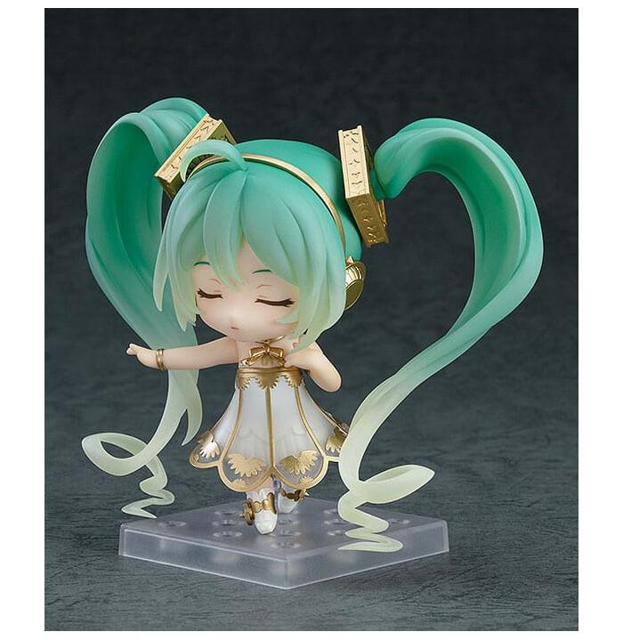 From "Character Vocal Series 01: Hatsune Miku" comes a Nendoroid of Hatsune Miku based off of the main visual from the full orchestra concert "Hatsune Miku Symphony 2020 ~5th Anniversary~". The Nendoroid faithfully captures the beautiful design originally illustrated by Rella. She comes with two face plates including a smiling expression and an expression with closed eyes.